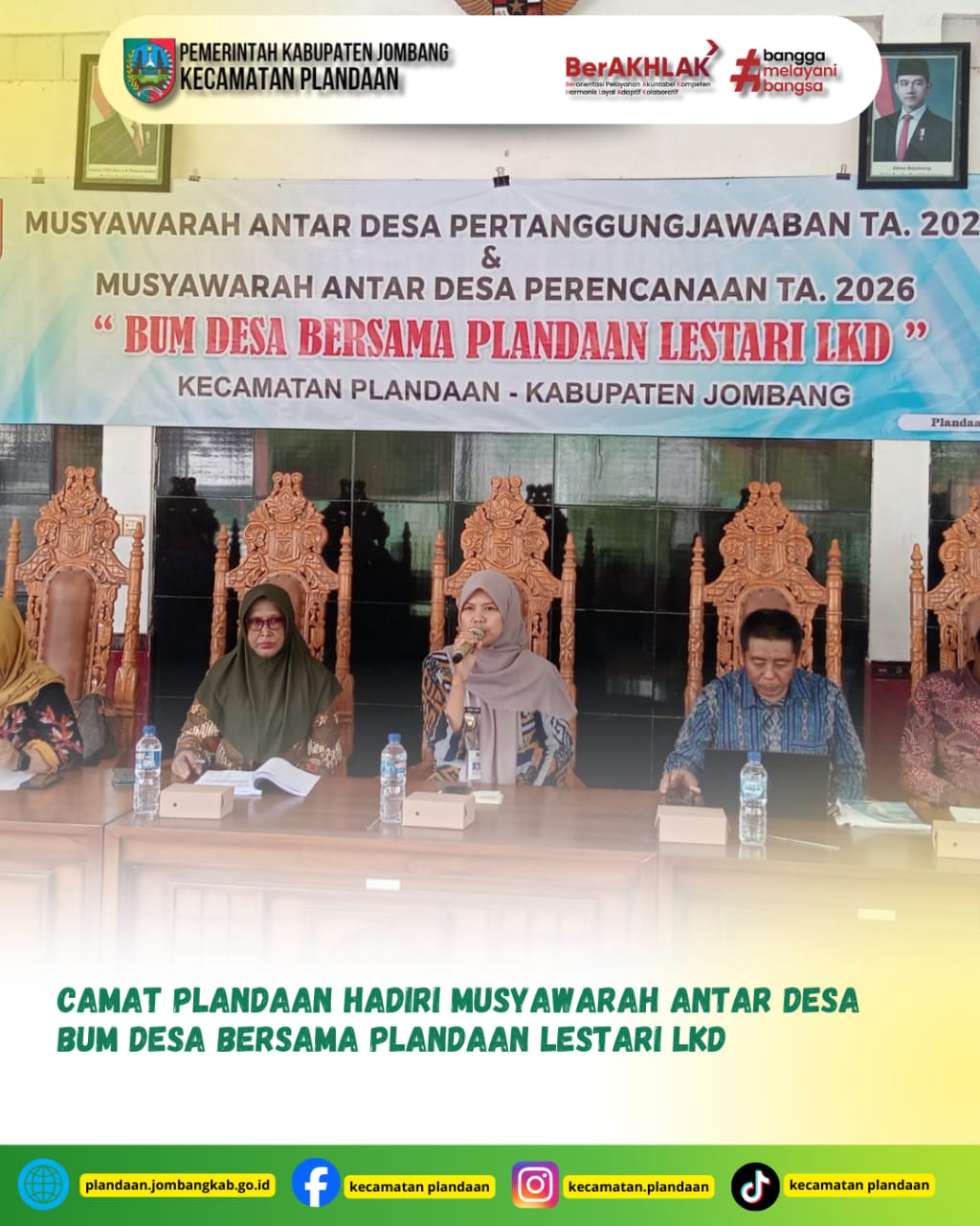 Camat Plandaan, Lia Aprilianna Isna Sari, S.STP., M.Si, menghadiri kegiatan Musyawarah Antar Desa (MAD) Pertanggungjawaban Tahun Anggaran 2025 dan Musyawarah Antar Desa Perencanaan Tahun Anggaran 2026 BUM Desa Bersama Plandaan Lestari LKD, yang diselenggarakan di Pendopo Kecamatan Plandaan, pada Kamis, 5 Februari 2026.