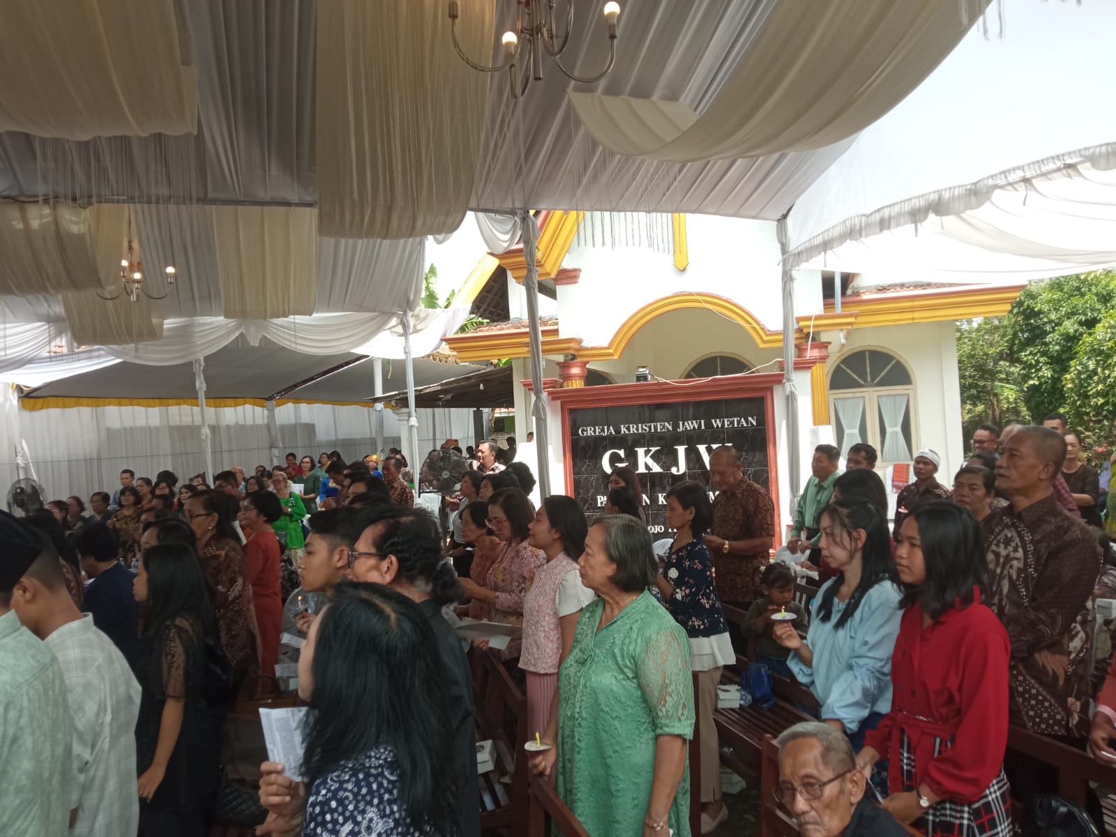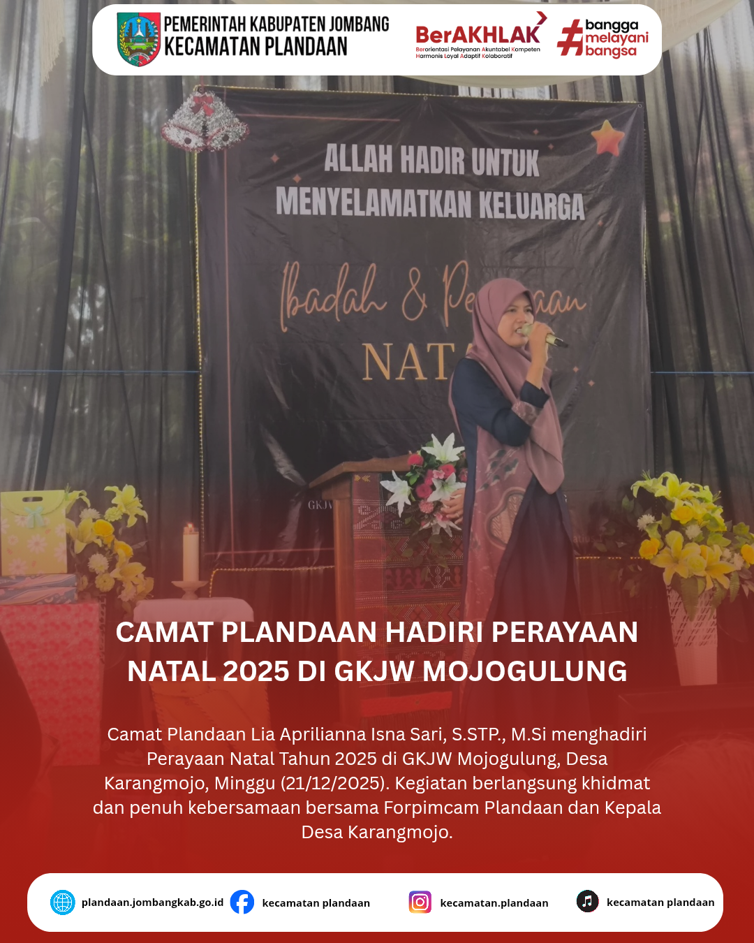 Camat Plandaan Lia Aprilianna Isna Sari, S.STP., M.Si menghadiri undangan Perayaan Natal Tahun 2025 yang diselenggarakan di Gereja Kristen Jawi Wetan (GKJW) Mojogulung, Desa Karangmojo, Kecamatan Plandaan, pada Minggu, 21 Desember 2025.