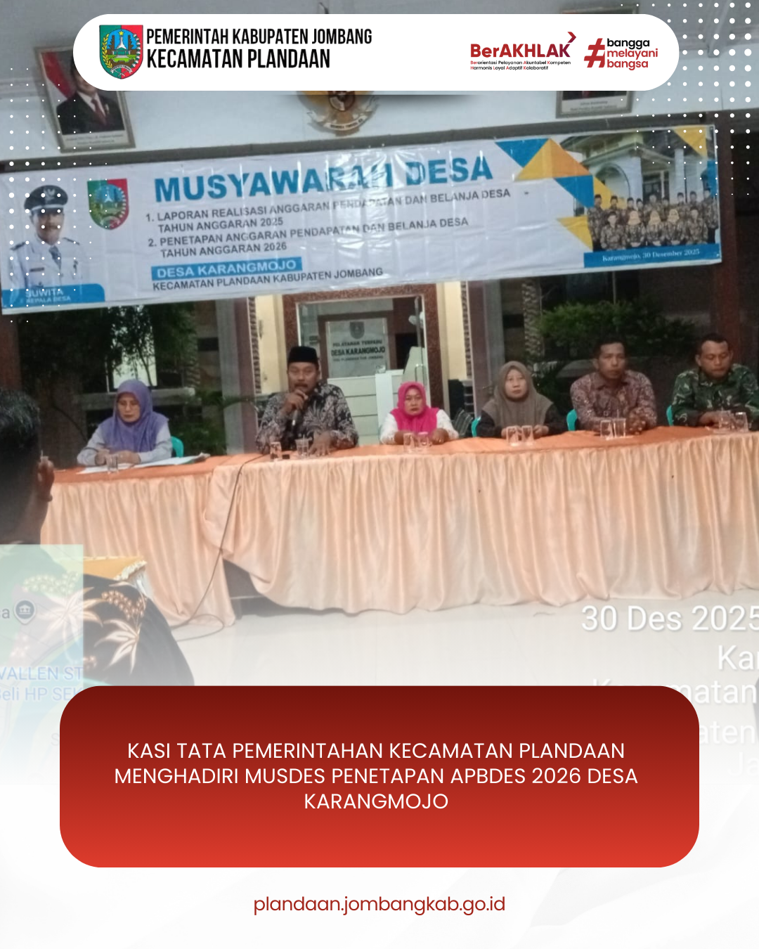 Kasi Tata Pemerintahan Kecamatan Plandaan Lina Agustien menghadiri kegiatan Musyawarah Desa (Musdes) Penetapan Anggaran Pendapatan dan Belanja Desa (APBDes) Tahun Anggaran 2026 yang dilaksanakan di Desa Karangmojo pada Selasa malam, 30 Desember 2025.