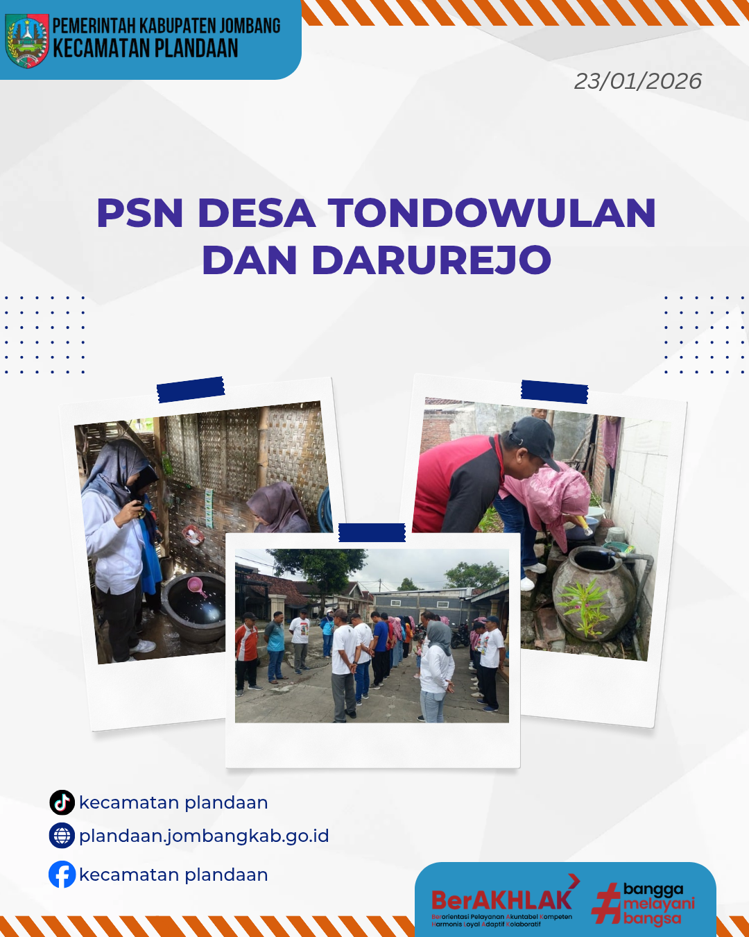 Pemerintah Kecamatan Plandaan bekerja sama dengan Puskesmas Plandaan melaksanakan kegiatan Pemberantasan Sarang Nyamuk (PSN) secara serentak di Desa Darurejo dan Desa Tondowulan pada Jumat, 23 Januari 2026. Kegiatan ini dilaksanakan sebagai upaya pencegahan penyebaran penyakit Demam Berdarah Dengue (DBD) serta meningkatkan kesadaran masyarakat akan pentingnya menjaga kebersihan lingkungan.