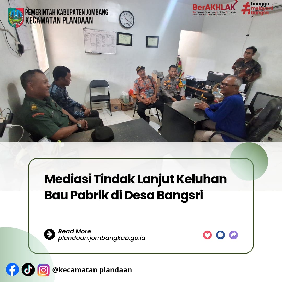 Forkopimcam Plandaan bersama Pemerintah Desa Bangsri melaksanakan mediasi dengan pihak pabrik bulu PT Sayap Emas Gemilang pada Kamis, 26 Februari 2026. Kegiatan dilaksanakan di lokasi pabrik sebagai tindak lanjut atas keluhan masyarakat terkait bau yang ditimbulkan dari aktivitas produksi.