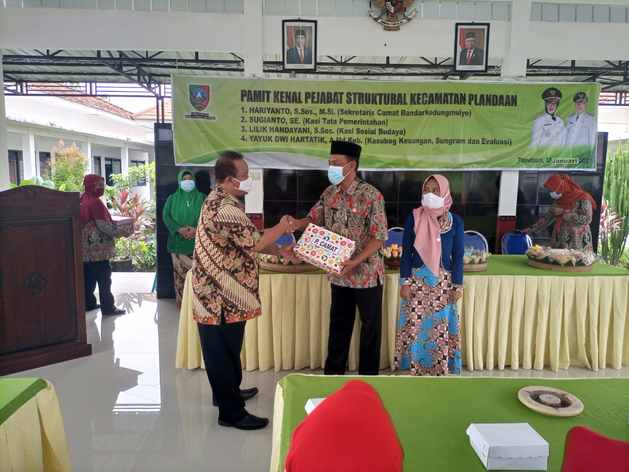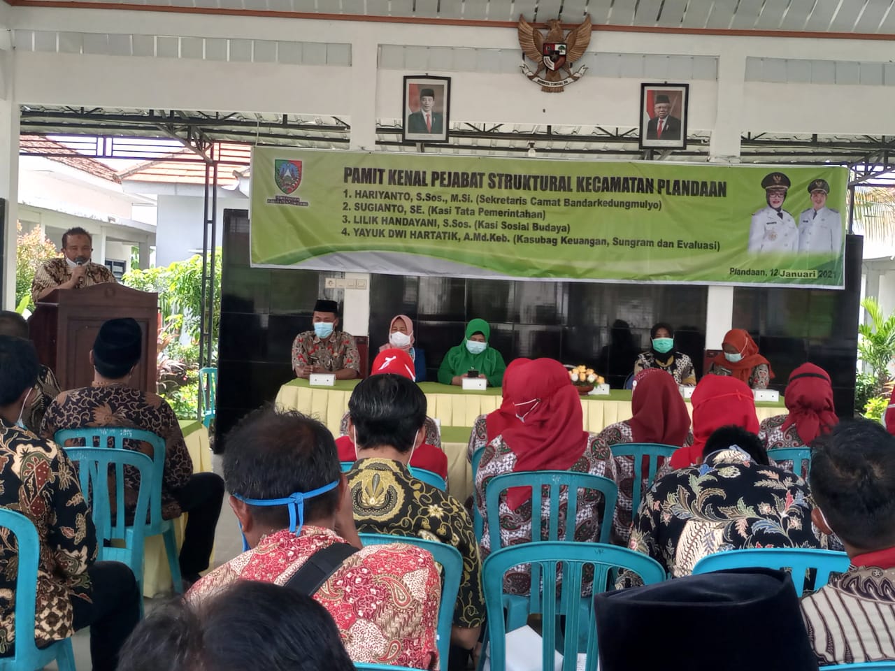 JOMBANGKAB - Bertempat Di Pendopo Kecamatan Plandaan , Pihak Kecamatan Plandaan melaksanakan Kegiatan Pamit Kenal Pejabat Struktural Kecamatan Plandaan guna melepas kepindahan pejabat lama sekaligus memperkenalkan pejabat baru pada Selasa pagi (12-01-2021).Acara ini di hadiri oleh Seluruh Kepala dan Sekretaris Desa se kecamatan Plandaan , tim pendamping desa maupun kecamatan , PLKB dan Pertanian.