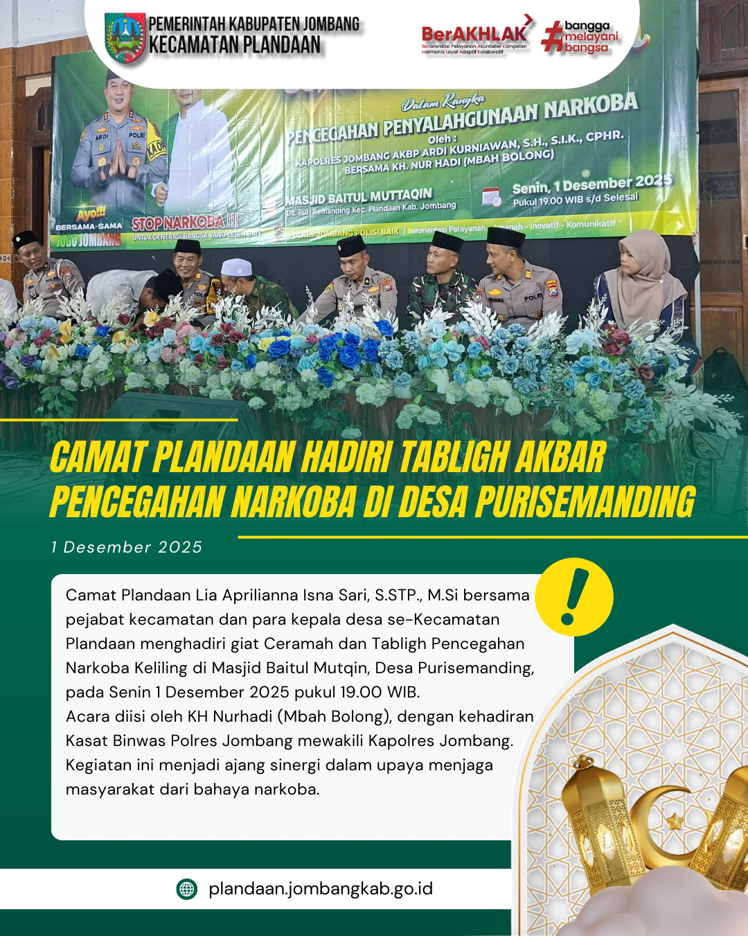 Camat Plandaan Lia Aprilianna Isna Sari, S.STP., M.Si bersama para pejabat struktural Kantor Kecamatan Plandaan serta para kepala desa se-Kecamatan Plandaan menghadiri undangan Kapolsek Plandaan dalam kegiatan Ceramah dan Tabligh Pencegahan Narkoba Keliling pada Senin, 1 Desember 2025 pukul 19.00 WIB.