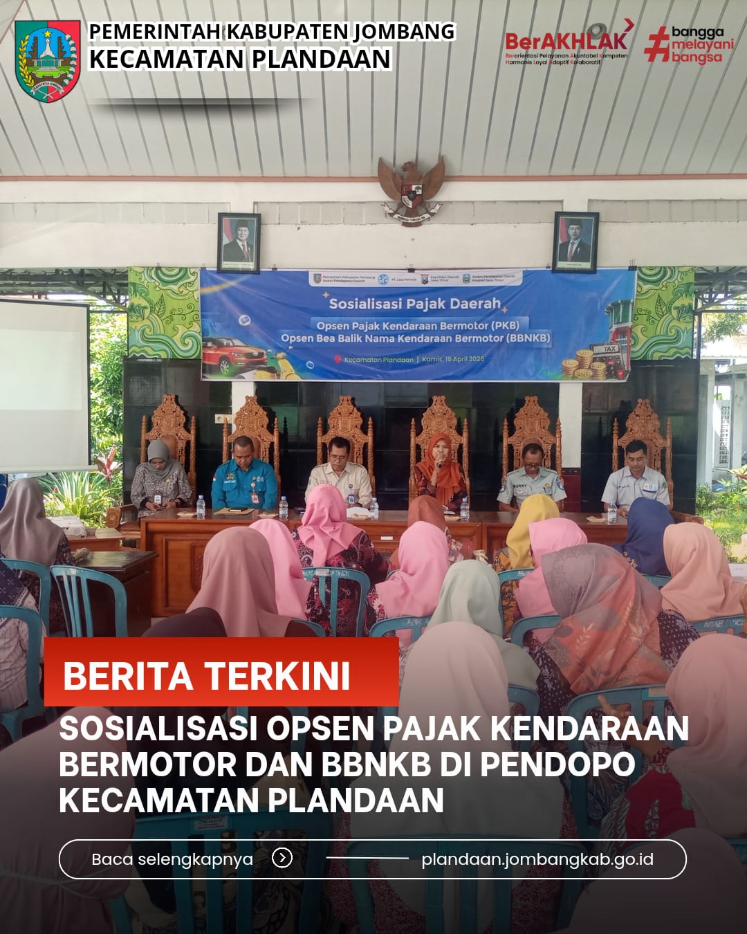 Plandaan, 16 April 2026 — Pemerintah Kecamatan Plandaan menyelenggarakan kegiatan sosialisasi terkait Opsen Pajak Kendaraan Bermotor (PKB) dan Opsen Bea Balik Nama Kendaraan Bermotor (BBNKB) pada hari Kamis, 16 April 2026, bertempat di Pendopo Kecamatan Plandaan.